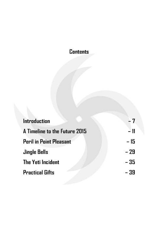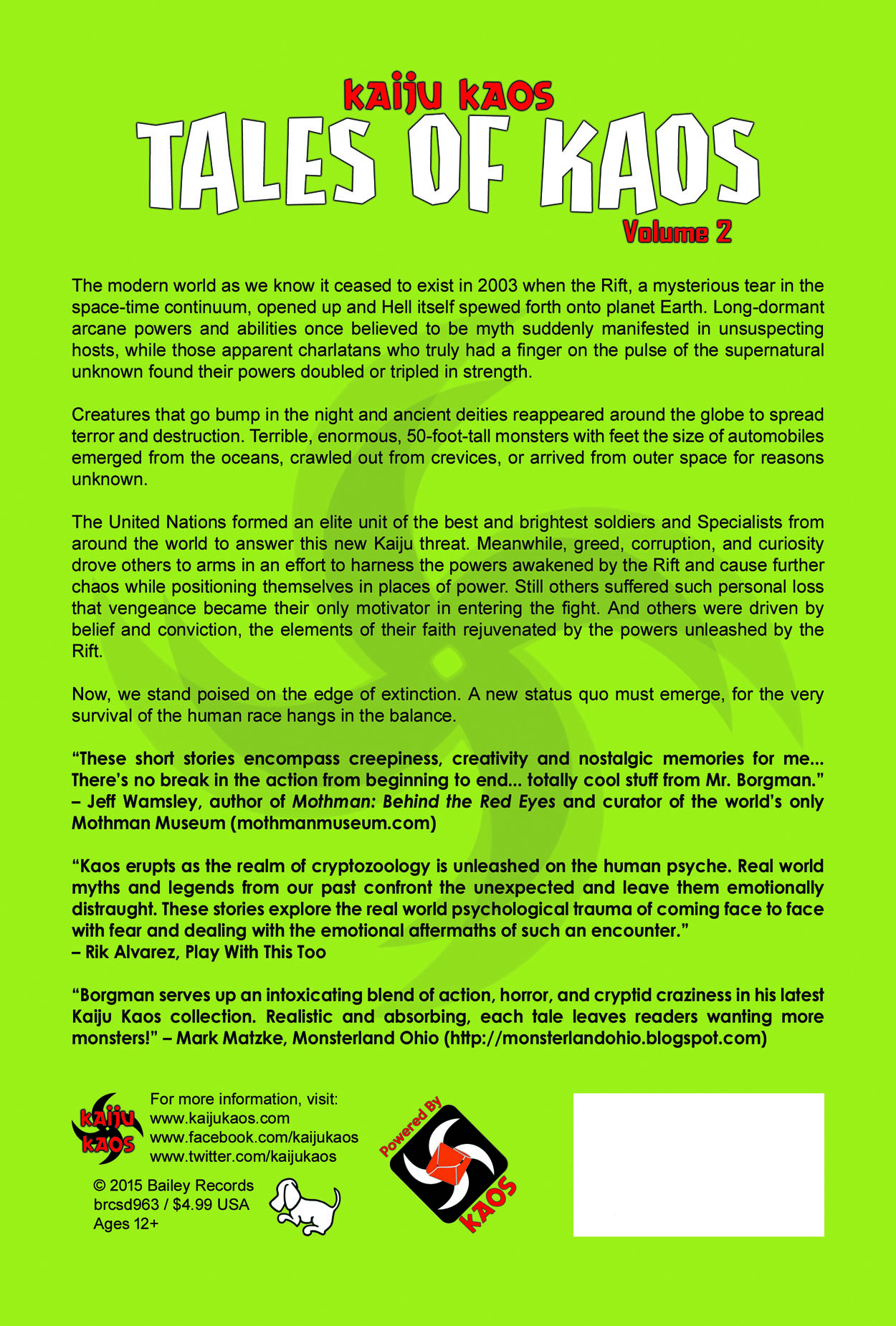 Kaiju Kaos: Tales of Kaos, Volume 2 contains 4 short stories centered around cryptids and the Christmas holiday / winter as well as an illustrated Timeline to the Future: 2015. These bits of fiction serves as an introduction to the world of Kaiju Kaos and as a series bible to inspire game play.