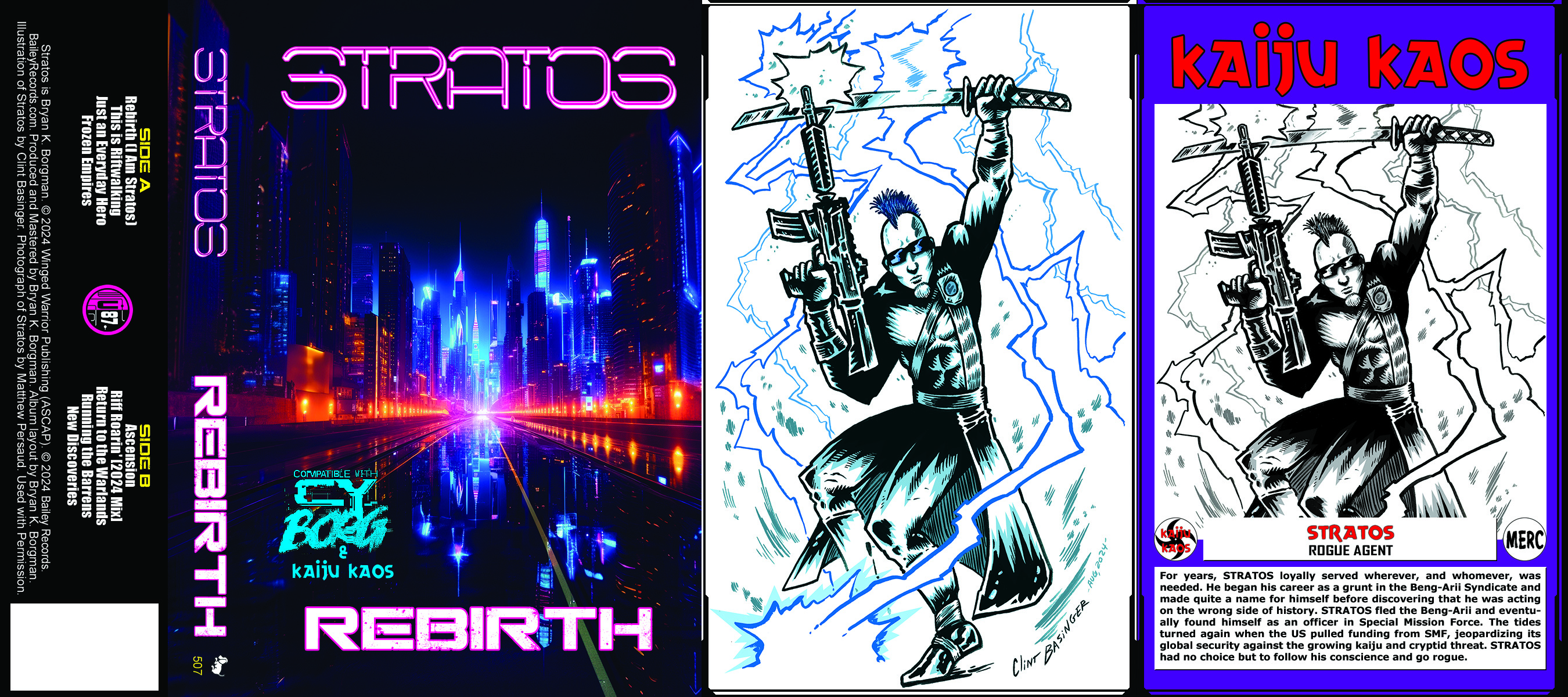 This limited edition cassette includes full color game stats to integrate "Stratos the Rogue Agent" into your game of Cy_Borg and/or Kaiju Kaos.