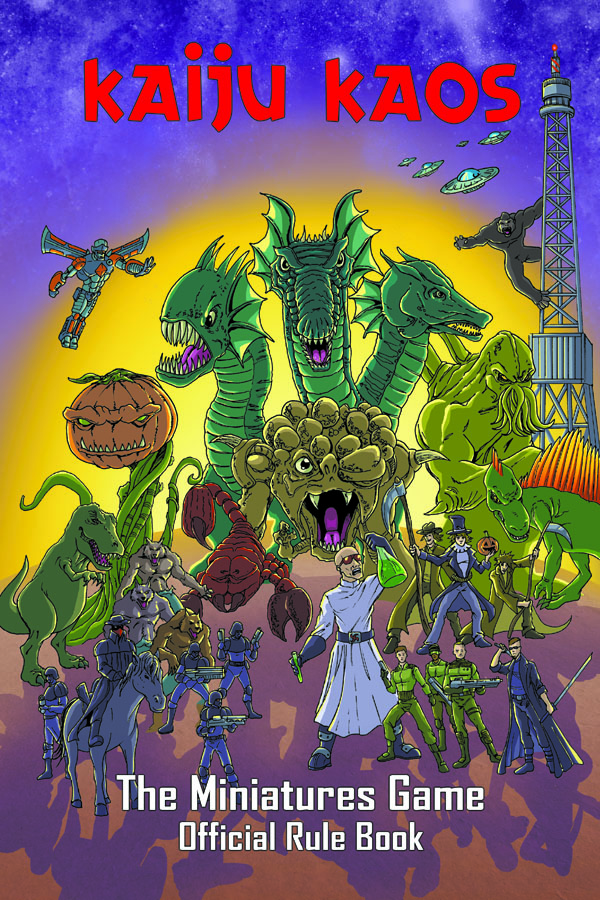 Kaiju Kaos: The Miniatures Game official rule book is a 72-page full color, perfect bound 6x9” printed booklet with glossy color cover (fits wonderfully in a modern comic book backer and protective sleeve).